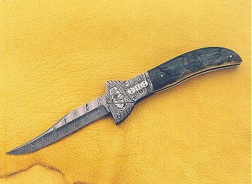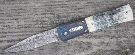" I've always wanted one of Steve's knives, but could never decide on an exact style or materials or just which way I wanted to go with it. We sat down at dinner and over good food and drink thrashed it out. I got a beautiful piece. Amazing materials and awesome fit and finish. A Damascus bowie blade (the shape if not the size picked out of a historic bowie book) ridiculously sharp too. Steve's classic skull and bones button for the switch mechanism within a Damascus bolster. Stacked bones file work on the backside of the jeweled titanium liner lock and the most gorgeous mastodon ivory, whites with blues, greens and browns that I and many others have ever seen before. Working out the order with Steve and finalizing the design concept and all the add ons (like the sapphire set into the release button) was easy and a lot of fun too. I even got a great leather sheath for my knife (slight tilt horizontal draw by my request) also made by Steve. I have shown that piece to various friends (many of whom are knifemakers and dealers) and was told that it may be some of Steve's best work, worth much more than I paid for it and it has a place of pride within my collection."![]() |
